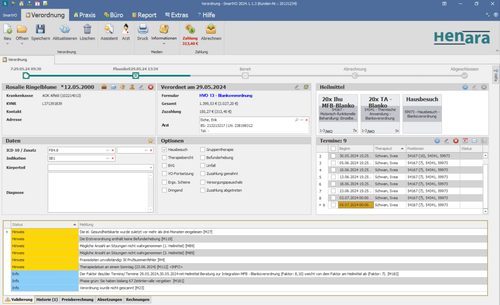 Der Verordnungswert berechnet sich entlang der Heilmittel und ihrer Zeitintervallen. Sobald die Verordnung abgeschlossen ist, kann sie mit den Kassen abgerechnet werden. Die Preislisten ziehen sich, wie gewohnt, automatisiert in die Verordnungsberechnung.