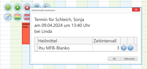 Neben der Therapie ist das Spannenste die Auswahl des Faktors. Ein Zeitintervall umfasst 15 Minuten, der Faktor bestimmt die Anzahl der Zeitintervalle. Diesen kann man im Terminfenster über den Plus- und Minus-Button anpassen. Bis zum Faktor 12 kann je Termin maximal ausgeschöpft werden.